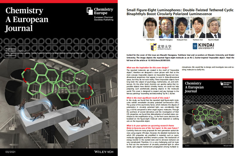 長谷川真士(デバイスグループ、北里大学) および今井 喜胤(評価グループ、近畿大学)の共同研究の成果が、Chemistry A European Journalに掲載 され、表紙に採択されました。北里大学および近畿大学からプレスリリースをいたしました。