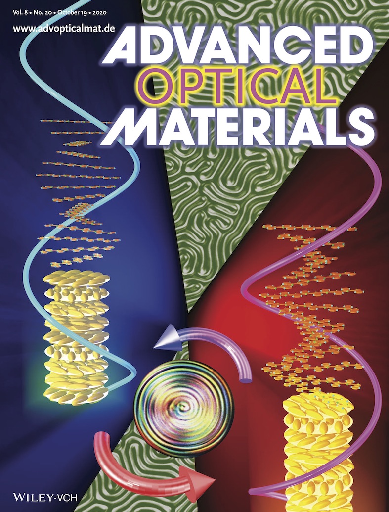 赤木和夫、花﨑知則、金子光佑(高分子グループ、立命館大学)らによる「光でキラル反転する液晶場での共役ポリマーの合成とヘリシティー制御」に関する共同研究の成果が、WILEY-VCHのAdv. Opt. Mater.に掲載(DOI:10.1002/adom.202000936)され、Inside front coverに選ばれました。