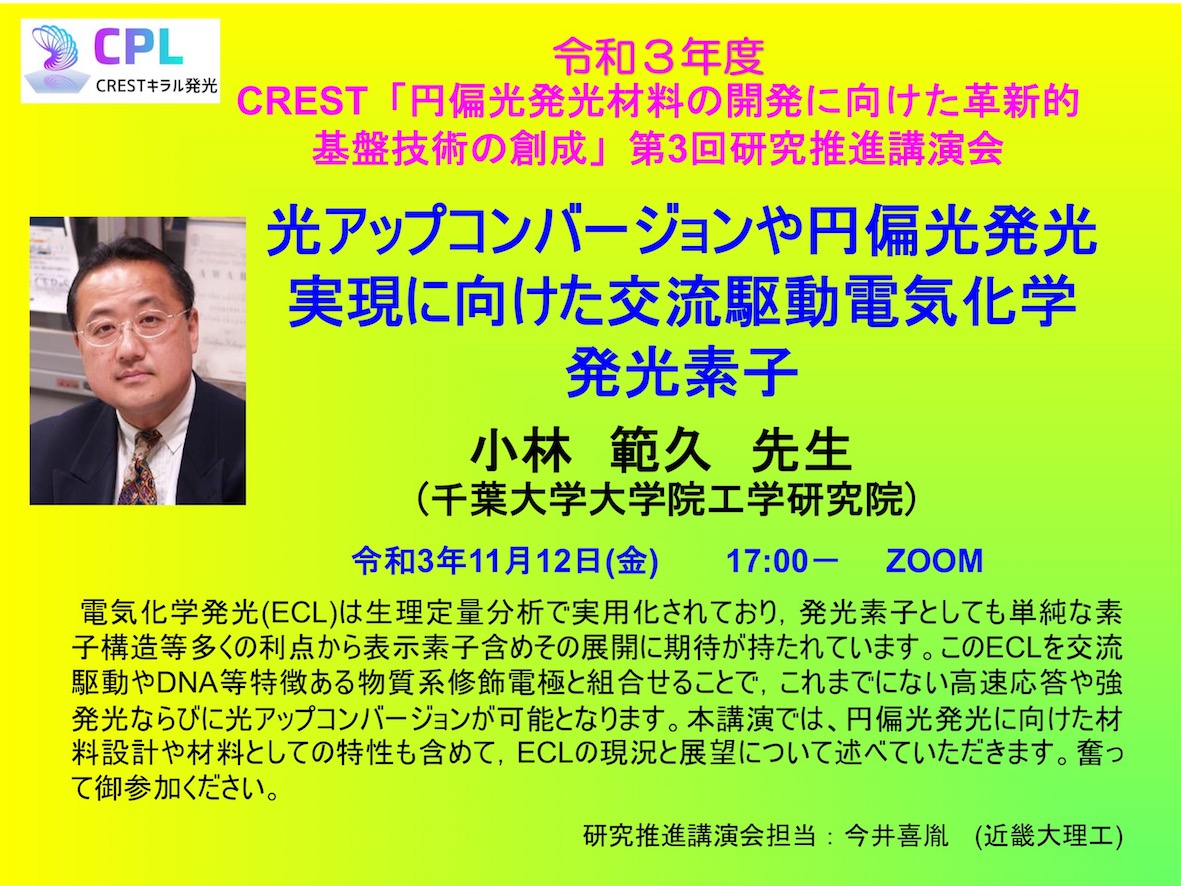 - 2020年11月1日: CREST研究"円偏光発光材料の開発に向けた革新的基盤技術の開発"を開始しました。