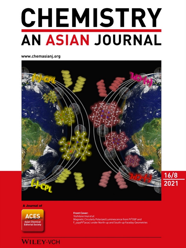 今井 喜胤(評価グループ、近畿大学)および八木 繁幸 ((デバイスグループ、大阪府立大学)による共同研究の成果が、Chemistry An Asian Journalに掲載され、表紙に採択されました。プレスリリースをいたしました。 アキラル(不斉構造を持たない)な白金錯体に外部から磁力を加えるというこれまでにない方法で円偏光を発生させることに成功しました。この方法を使うことで、円偏光発光体の製造コストを安く抑えることができるため、将来的に3D表示用有機ELディスプレイ等の製造コストの削減や、高度な次世代セキュリティー認証技術の実用化などに繋がることが期待されます。