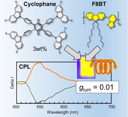 長谷川真士、西川浩之(デバイスグループ: 北里大学、茨城大学)らによる研究がAdvanced Functional Materials 誌に掲載されました。 わずか3%添加するだけで有機ELデバイス等に用いられる汎用発光性ポリマー(F8BT)を円偏光発光性の色素材料に変えるキラル誘起添加剤を開発しました。新しく開発した添加剤は[2.2]パラシクロファンとカルバゾールからなるキラル分子で、新規合成法を適用することで初めて合成が達成されました。 本研究で開発したキラル誘起添加剤(キラルシクロファン)を利用することで、有機デバイスに汎用的に利用されるキラリティーを持たないポリマーを円偏光発光材料として利用することができます。これにより、円偏光発光材料の製造コストを抑えることができ、発光デバイス等への応用につながります。
